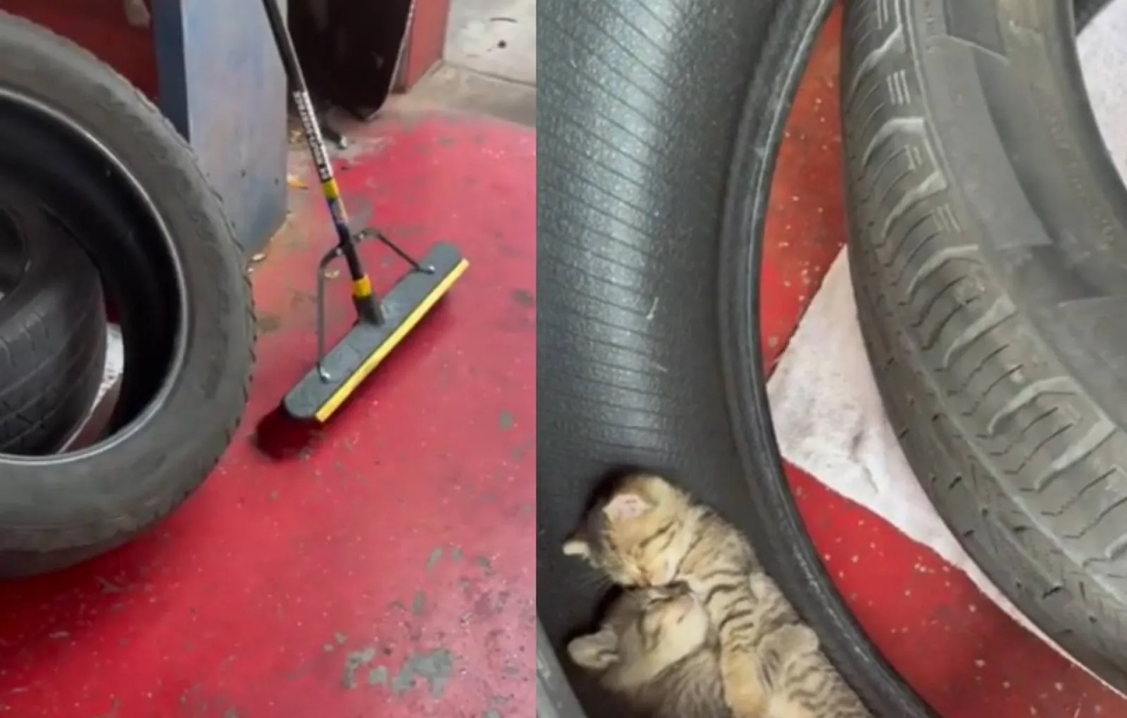 Встретить маленьких котят можно везде. Автор этого ролика, к примеру, обнаружил крох на работе спящими в старых покрышках.