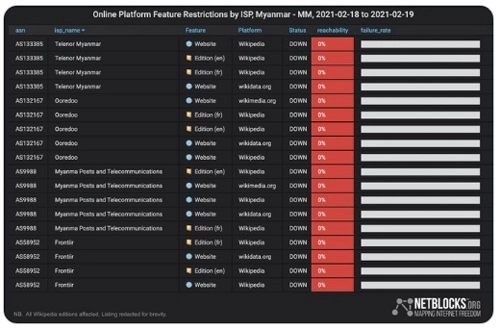 «Военные Мьянмы заблокировали Википедию после запрета Facebook и масштабных отключений интернета», — сказано в Twitter организации.