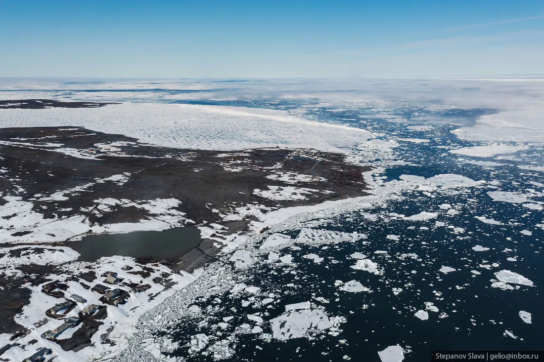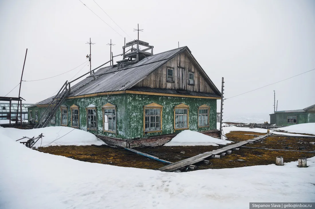 49. Раньше здесь был жилой посёлок со своей администрацией, медпунктом, почтой, детским садом. На берегу была взлётно-посадочная полоса, раз в неделю прилетал самолёт. Сейчас все снабжение происходит один раз в год — к мысу подходит ледокол «Михаил Сомов», который доставляет продукты, оборудование, топливо, привозит на станцию новую смену полярников.