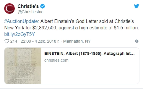 Ранее сообщалось, что письмо Альберта Эйнштейна философу Эриху Гуткинду, посвященное вопросам религии, было продано в декабре 2018 года на аукционе Christie’s почти за 3 млн долларов.