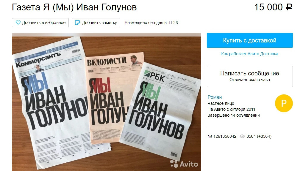 На крупнейшем интернет-сервисе частных объявлений «Авито» пользователь разместил объявление о продаже газет «Коммерсант», РБК и «Ведомости», опубликовавших на первой полосе заголовки «Я/Мы Иван Голунов».