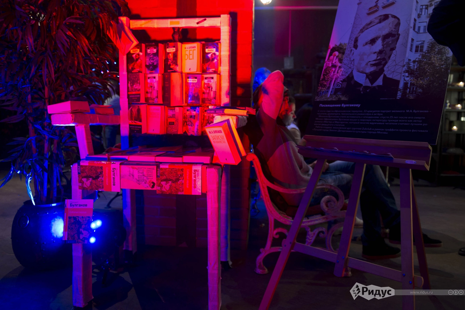 «Что-то мне это напоминает…», — подумалось автору репортажа, и в первом же культурном пространстве я наткнулся на трон, сделанный из книг Михаила Афанасьевича. Вздрогнул и вспомнил, что место, где располагается заведение, называется Кулишки — или Куличики. И выражение «у черта на Куличиках» появилось после одной шумной московской истории, связанной с полтергейстом и прочим лукавством и произошедшей именно здесь.
