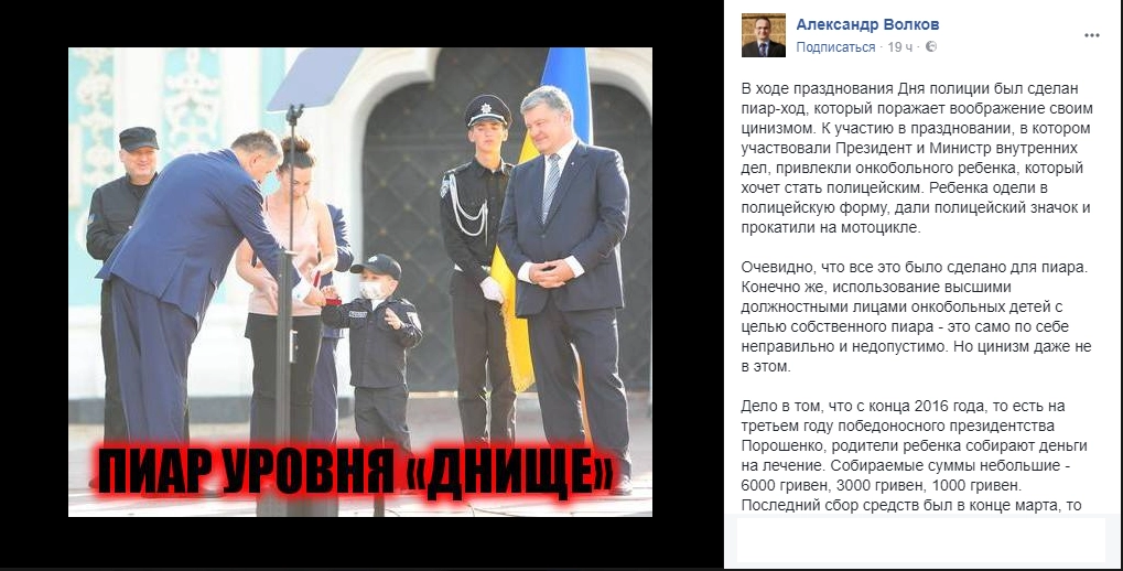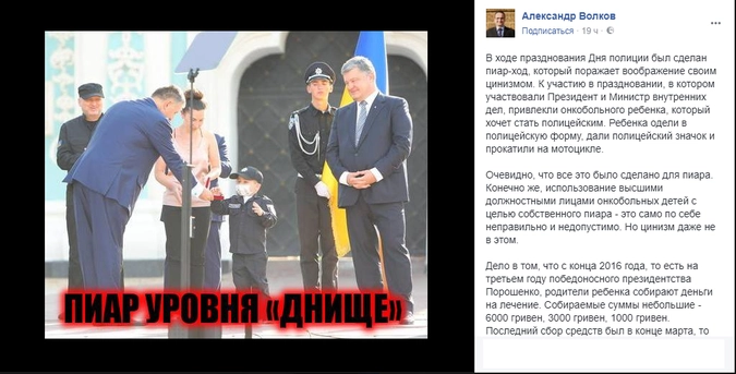 По следам прошедшего на днях на Украине Дня полиции в обществе разгорелась нешуточная дискуссия, касающаяся этических норм президента страны Петра Порошенко. Основанием для обсуждения стало участие в праздничных мероприятиях 4-летнего мальчика, страдающего онкологическим заболеванием. Порошенко вместе с министром внутренних дел Арсеном Аваковым подарили ребенку именной жетон, после чего его прокатили на полицейском мотоцикле.
