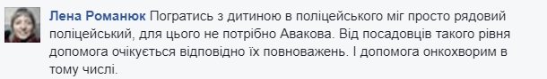 Перевод с украинского: «Поиграть с ребенком в полицейского мог просто рядовой полицейский, для этого не нужен Аваков. От госслужащих такого уровня помощь ожидается, соответствующая их возможностям. И помощь онкобольным в том числе».