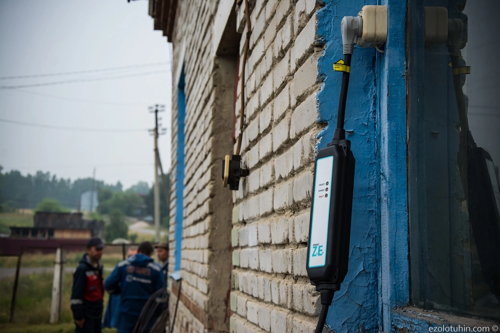 Первая остановка автопробега — поселок Памяти 13 Борцов, примерно в 50 километрах от Красноярска. Здесь нас встречают работники МРСК Сибири и помогают подзарядиться через обычную розетку. Такой автомобиль здесь видят впервые.