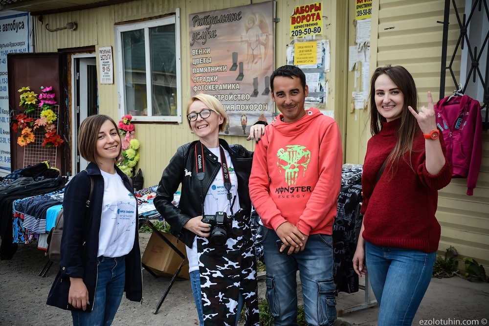 А это участницы нашей экспедиции и местный козульский парень, который продает самые модные в Коузльке штаны!