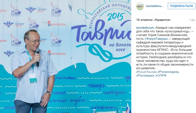 Участникам смены «Молодые преподаватели истории» также удалось пообщаться Юрием Вяземским, заведующим кафедрой мировой литературы и культуры факультета международной журналистики МГИМО, на тему культурного кода России. Гость назвал участников форума «источником большого оптимизма» и высказал мнение, что именно в руках молодёжи сосредоточена возможность сделать эту «богатейшую талантливую страну успешной».