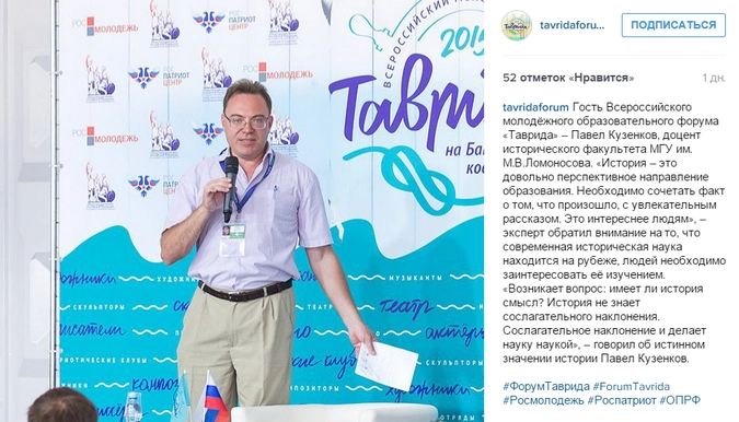 Одним из гостей второго дня стал Павел Кузенков, кандидат исторических наук, доцент исторического факультета МГУ им. Ломоносова. Он придерживается мнения, что наука для молодых историков — это, прежде всего, история удивительных людей. «Мы находимся на гребне человеческой истории. Но к этому нужно относиться осторожнее, так как история — это сильное оружие», — предупреждает лектор. Ученый также затронул темы общего понятия цивилизации, выбора государственной религии, и ее роли в истории государства.