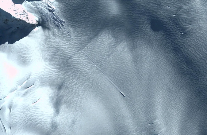 Действительно, если перейти по координатам 54°39'44.62"S 36°11'42.47"W, то можно увидеть, что на льду появился какой-то странный объект. Но из-за низкого качества изображения о его подлинной природе можно строить только гипотезы.