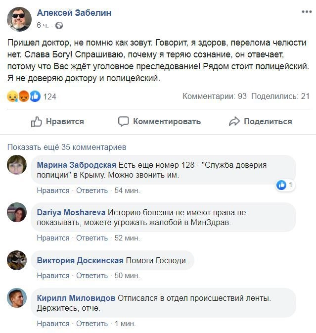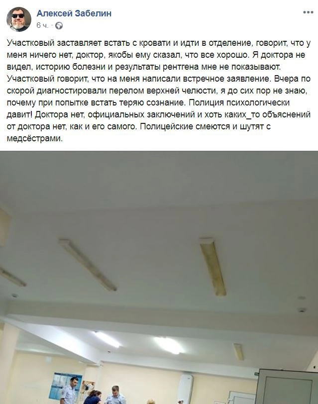 «Участковый заставляет встать с кровати и идти в отделение, говорит, что у меня ничего нет, доктор, якобы ему сказал, что все хорошо. Я доктора не видел, историю болезни и результаты рентгена мне не показывают. Участковый говорит, что на меня написали встречное заявление. Вчера по скорой диагностировали перелом верхней челюсти, я до сих пор не знаю, почему при попытке встать теряю сознание. Полиция психологически давит!», — пожаловался он.