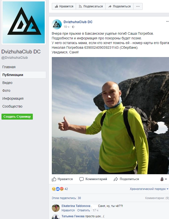 «Вчера при прыжке в Баксанском ущелье погиб Саша Погребов. Подробности и информация про похороны будут позже», — сообщили на странице бейсджамперского клуба DvizhuhaClub в Facebook.