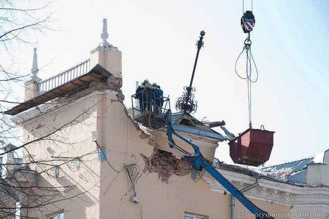 Сегодня ночью в Кемерово на доме № 27 по ул. Островского 1955 года постройки произошло разрушение декоративной башни (диаметр — 3 метра, высота — 5 метров, основание купола железобетонное). При этом было повреждено потолочное перекрытие верхнего этажа. Из жильцов никто не пострадал. На место немедленно прибыли сотрудники МЧС и городская аварийная бригада. Было принято решение эвакуировать 22 человека из пострадавшего подъезда до выяснения возможных последствий.