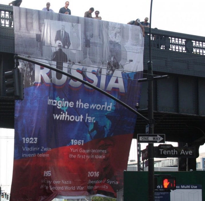 Судя по всему, авторы баннера в центре Нью-Йорка выступили таким образом против теории американской исключительности, напоминая, что современный мир без больших побед и научных достижений России был бы совершенно другим.