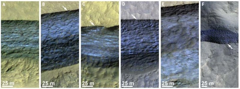 В этих точках возвышаются отвесные утесы, отчасти разрушенные эрозией. На сломе утесов на снимках виден голубой многослойный лед. MRO делал эти снимки на протяжении трех марсианских лет, что заняло пять лет и семь месяцев земного времени.