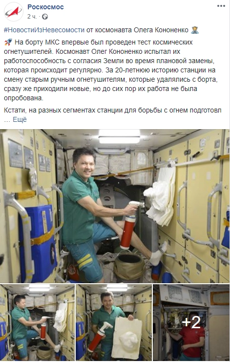 «За 20-летнюю историю станции на смену старым ручным огнетушителям, которые удалялись с борта, сразу же приходили новые, но до сих пор их работа не была опробована», — говорится в сообщении Роскосмоса в Facebook.