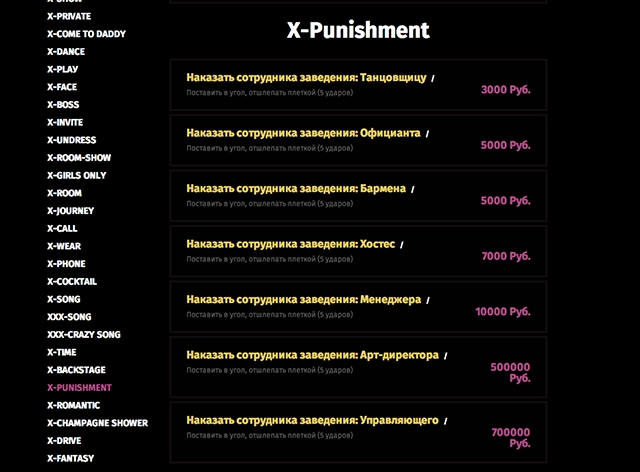 LifeNews сообщает, что «завуалированно, но оказание сексуальных услуг входило в прайс-лист заведения»: в списке услуг, которые может оказывать персонал заведения — уединение с танцовщицей в комнате на час, увольнение танцовщицы на одну смену (то есть ее можно забрать с собой), наказание сотрудников — например, поставить в угол и отшлепать плеткой.