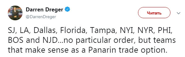 Журналист TSN Даррен Дрегер написал в своем Twitter-аккаунте о том, что заполучить россиянина мечтают «Сан-Хосе Шаркс», «Лос-Анджелес Кингз», «Даллас Старз», «Флорида Пантерз», «Тампа-Бэй Лайтнинг», «Филадельфия Флайерз», «Нью-Йорк Айлендерс», «Нью-Йорк Рейнджерс», а также «Бостон Брюинз» и «Нью-Джерси Девилз».
