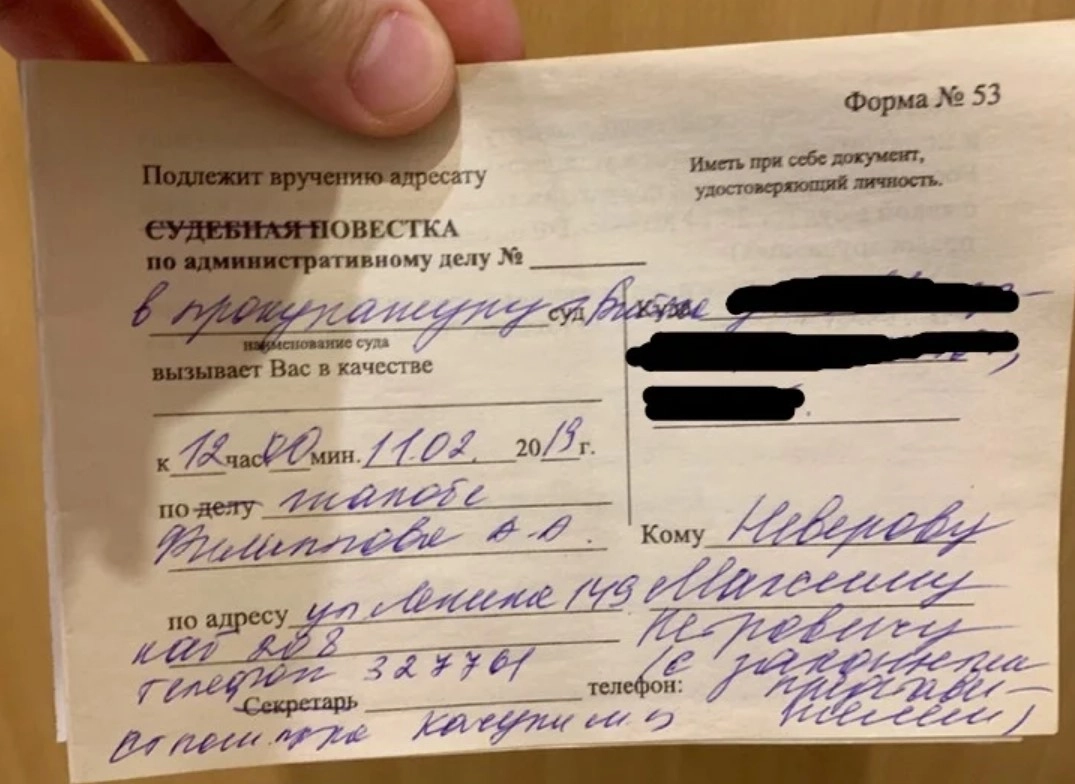 «Вот это мне положили вчера в почтовый ящик. Видимо, нормальной повестки у них не оказалось (кризис, чо), поэтому они взяли судебную повестку и зачеркнули в ней слова „судебная“, „делу“ и „секретарь“», — написал школьник в соцсетях.