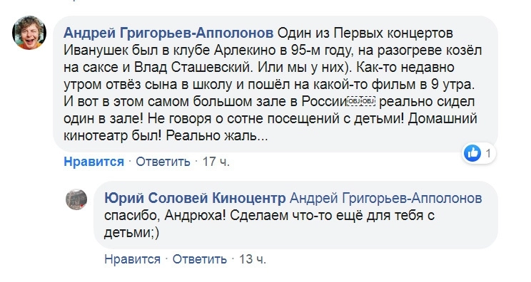 Коллеги по цеху поддержали основателя киноцентра. Так, например, Андрей Григорьев-Аполлонов посетовал на то, что этот кинотеатр был родным и домашним.