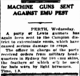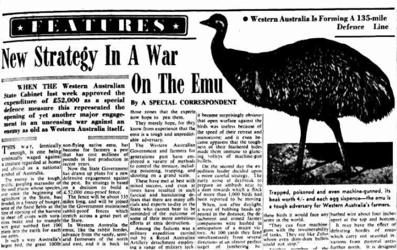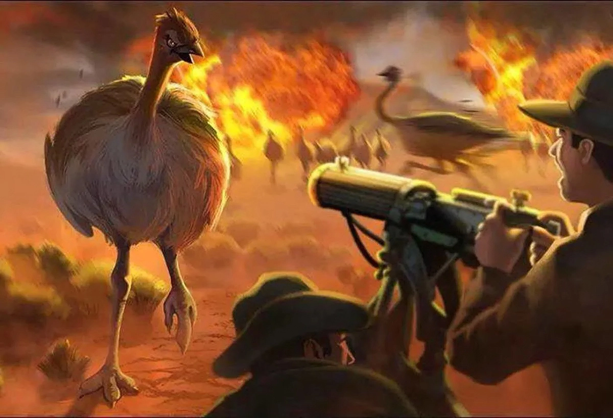 В ноябре 1932 года подразделение майора Мередита из седьмой тяжёлой батареи Королевских Австралийских сил артиллерии первым вступило в Войну с эму. Эти гигантские птицы стали настоящим бичом для фермеров Западной Австралии. Они ураганом обрушились на созревшие поля пшеницы во время привычной миграции после брачного сезона на юго-западное побережье континента. На каждый съеденный колосок приходилось сто вытоптанных растений.