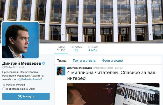 Новость сообщил сам глава правительства, выложив при этом свою фотографию у экрана монитора, который показывает страницу @MedvedevRussia в «Твиттере» с верхней записью от 27 июля.