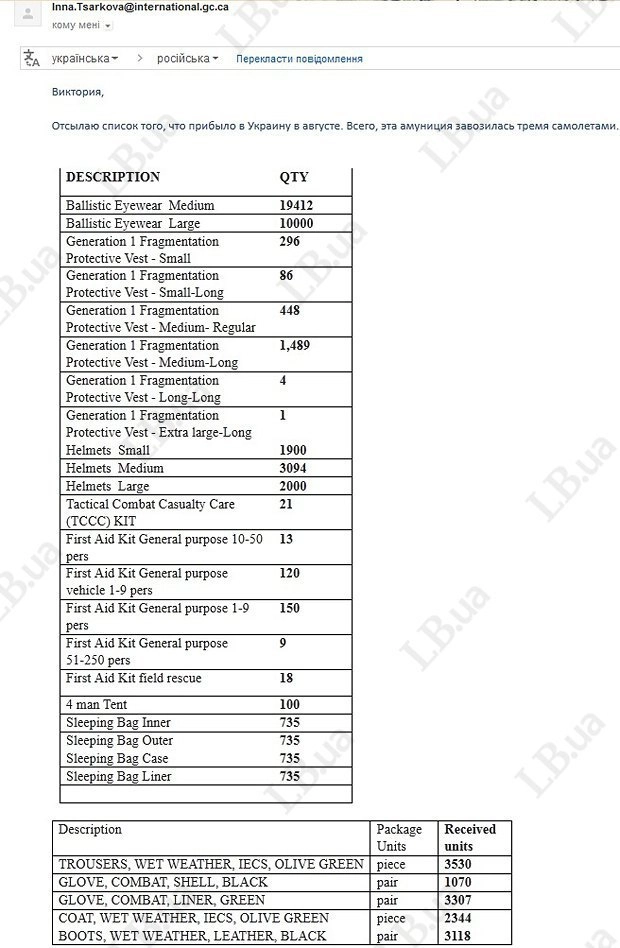 Канада направила груз еще в августе. В него входили 19 тысяч 412 средних баллистических очков, 10 тысяч больших баллистических очков, 296 маленьких противоосколочных бронежилетов, 86 маленьких длинных противоосколочных бронежилетов, 448 средних обычных противоосколочных бронежилетов, 1489 средних длинных противоосколочных бронежилетов и еще 5 удлиненных.