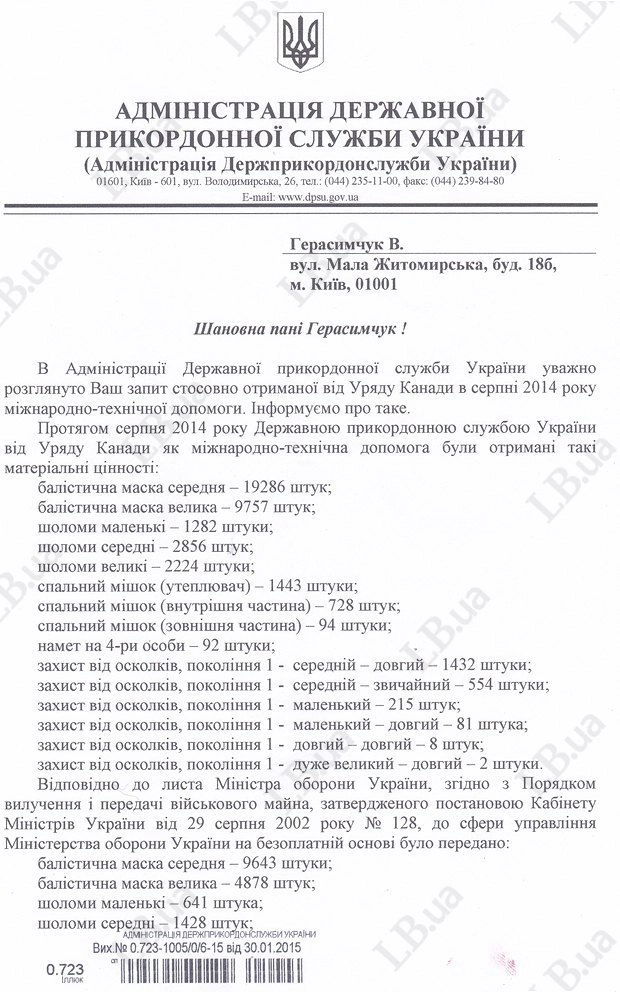 Журналисты LB.ua заинтересовались судьбой груза и попросили Госпогранслужбу озвучить, сколько и какого снаряжения она приняла от канадцев в августе, а также — какие конкретно подразделения это снаряжение получили.