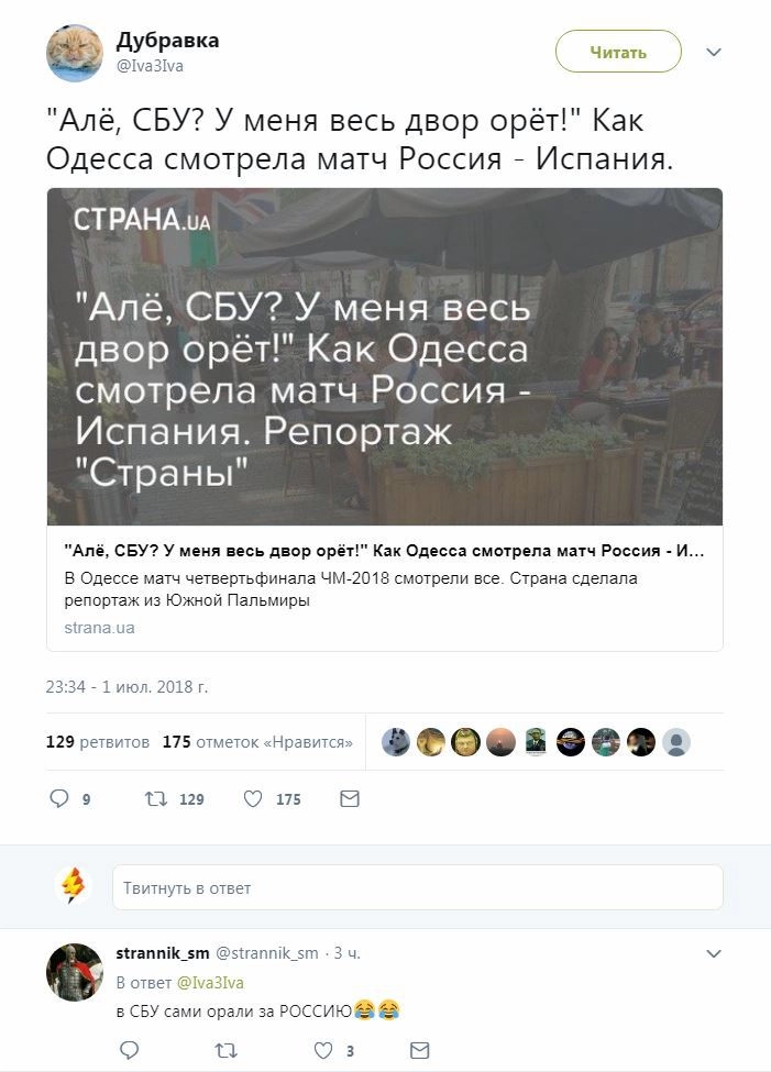 «Але, СБУ? У меня весь двор орет! Как Одесса смотрела матч Россия — Испания», — с таким заголовком одно из популярных украинских изданий «Страна.ua» опубликовало свой репортаж о событиях 1 июля.