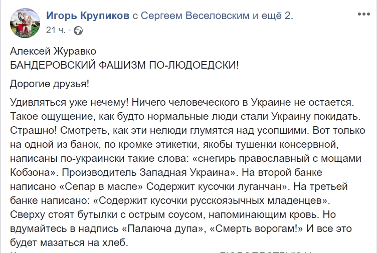 Поверьте мне, не все украинцы такие подлецы и негодяи. Большинство людей в Украине — нормальные. Мне стыдно! Это самое настоящее кощунство то, что я увидел на фотографиях, — написал Журавко.