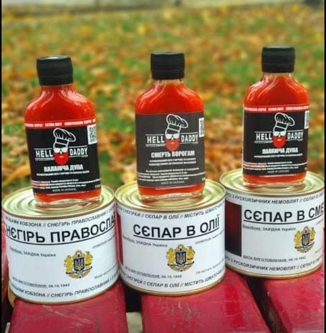 Кроме консервов, в продаже также имеются соусы с надписью «Смерть врагам». Дизайн этикеток дополняет черно-красный флаг Украинской повстанческой армии (экстремистская организация, запрещенная в России).