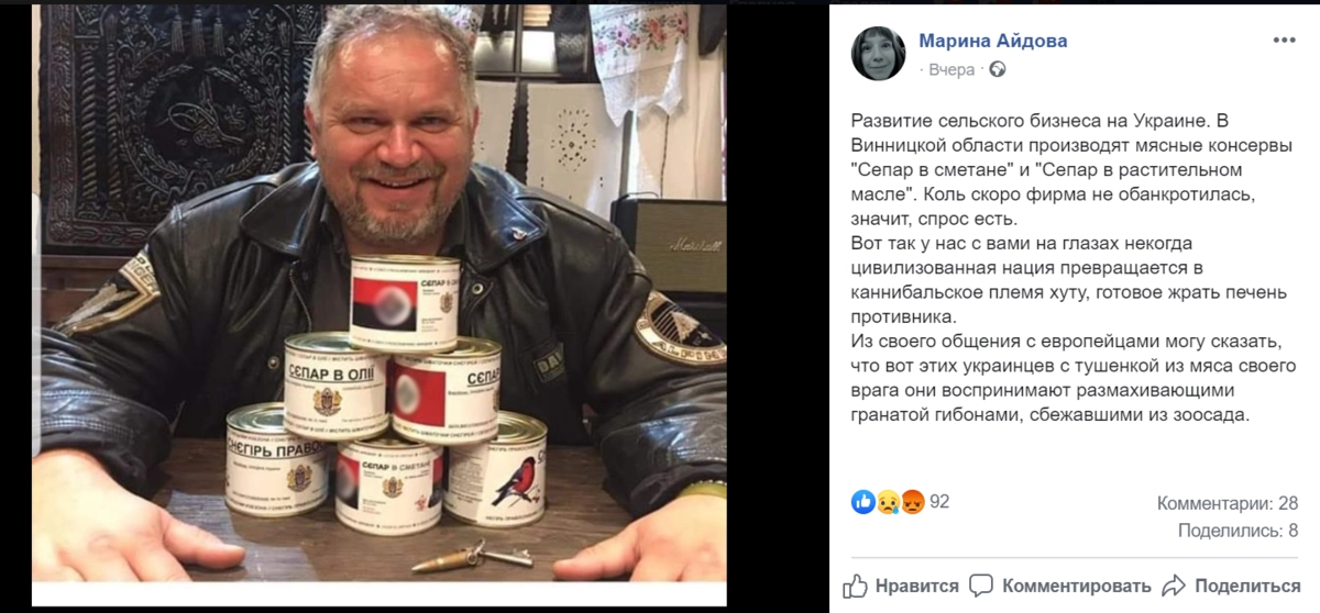 Бизнесмен Александр Грамарчук, который принимал участие в гражданском конфликте на юго-востоке страны, занялся производством мясных консервов «Сепар в сметане», «Снегирь православный» и «Сепар луганский выдержанный». На странице в фейсбуке он без стеснения выкладывает фотографии своей продукции.