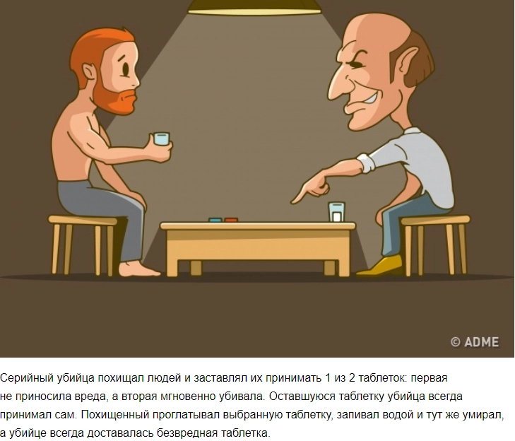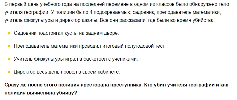 Мальчик случайно обмолвился, что сегодня он с одноклассниками выяснял, кто убил учителя. Мать начала расспрашивать сына. Оказалось, что, изучая этот предмет, школьники регулярно решают задачи о серийных маньяках, различных видах казни, ограблениях, виновными в которых оказываются беременные женщины.
