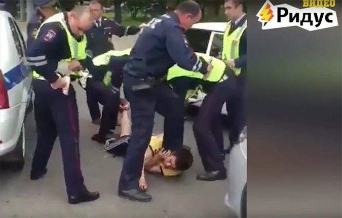 На кадрах видно, как правоохранители сначала бьют руками и ногами по стеклу на двери водителя. Затем, когда им удалось открыть дверь машины, они резко выволакивают мужчину из салона под дулами пистолетов, бросают на его землю, бьют руками и ногами.