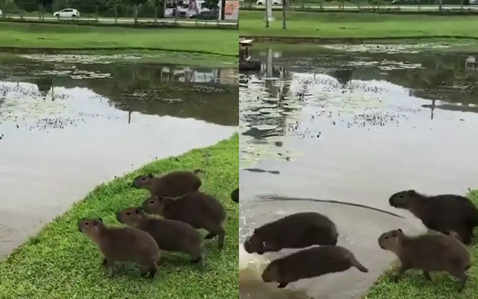 Маленькие капибары из этого видео, опубликованного в Telegram-канале «Лепра», решили искупаться большой дружной компанией. Совместное ныряние грызунов выглядело как самое редкое и умилительное природное явление — капибаропад.