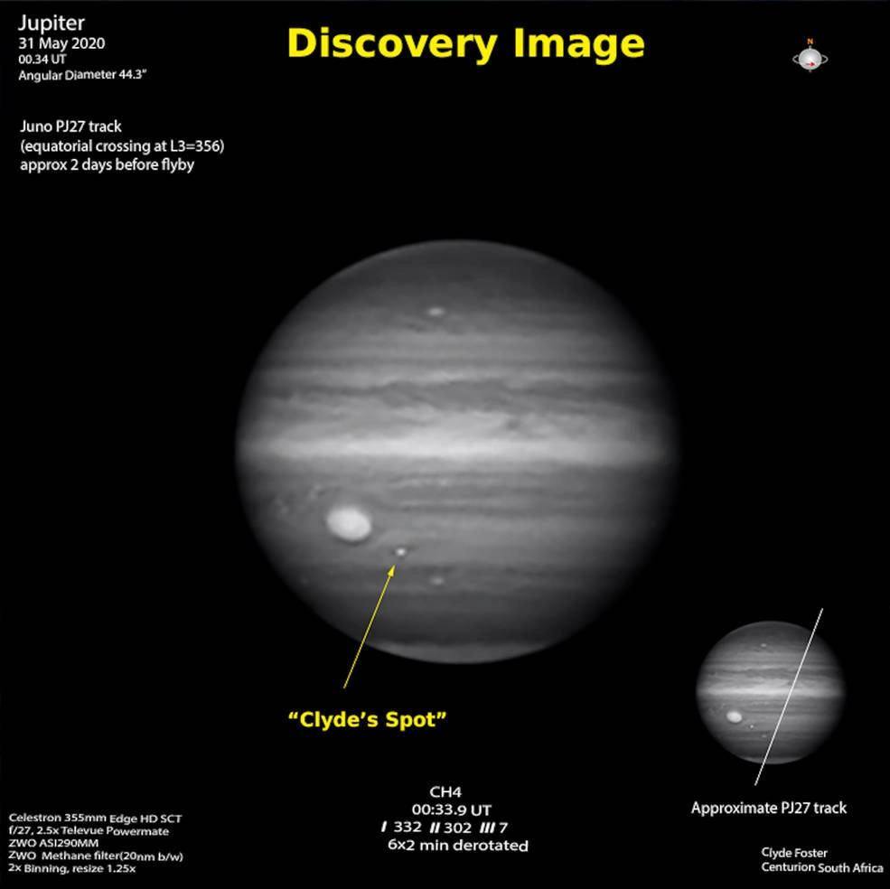 Шторм, получивший название «пятно Клайда» представляет собой шлейф облачного материала, извергающегося над верхними слоями облаков атмосферы Юпитера.