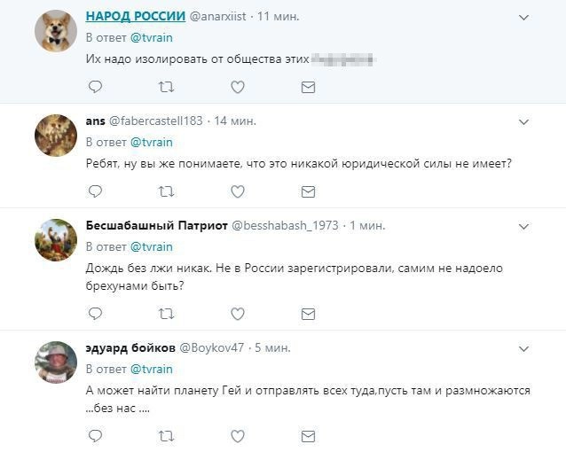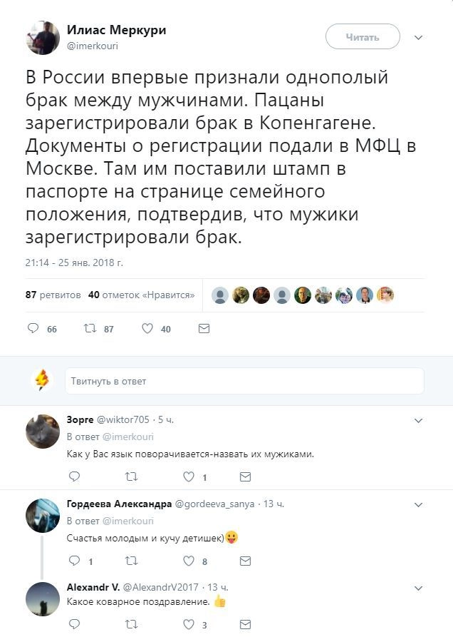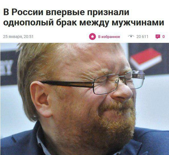 Новость о первом в России официальном признании регистрации брачного союза двух мужчин шокировала пользователей Рунета — блоги и социальные сети ломятся от отзывов и замечаний, по большей части гомофобных, но не обходится и без сарказма.