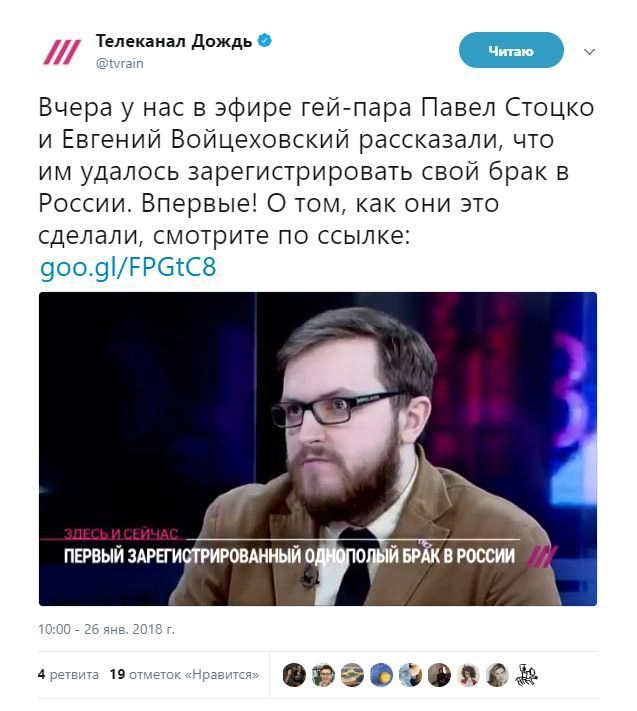 Как сообщал «Ридус», накануне вечером пара геев Евгений Войцеховский и Павел Стоцко заявили, что им удалось впервые в истории России официально получить документы на однополый брак. Сперва они выехали в Копенгаген, где местное законодательство позволяет иностранцам заключать брак, а затем успешно прошли процедуру регистрации уже заключенного союза в России.