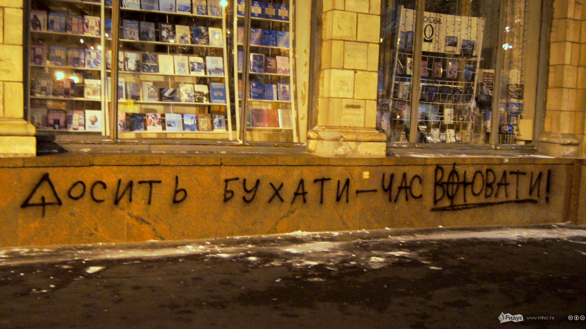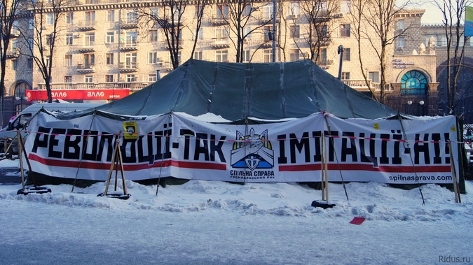 А в среду, 29 января на платформе Евромайдана произошла первая крупная «междоусобица». Её предвестником был ещё недавний захват Минюста, произведенный движением «Спiльна справа» («Совместное дело», не входят в коалицию «Правый сектор»). В декабре они украсили свои палатки и весь Майдан плакатами «Революции – да, имитации – нет».