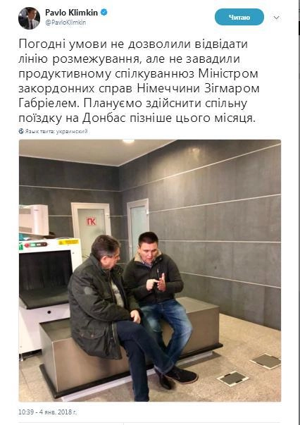 «Погодные условия не позволили посетить линию разграничения, но не помешали продуктивному общению с министром иностранных дел Германии Зигмаром Габриэлем. Планируем осуществить совместную поездку на Донбасс позже в этом месяце», — написал он.
