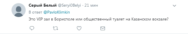 Кое-кого удивил сам снимок — министры запечатлены в довольно непрезентабельном месте, похожем на туалет. «Это VIP-зал Борисполя или туалет на Казанском вокзале?» — поинтересовались комментаторы.