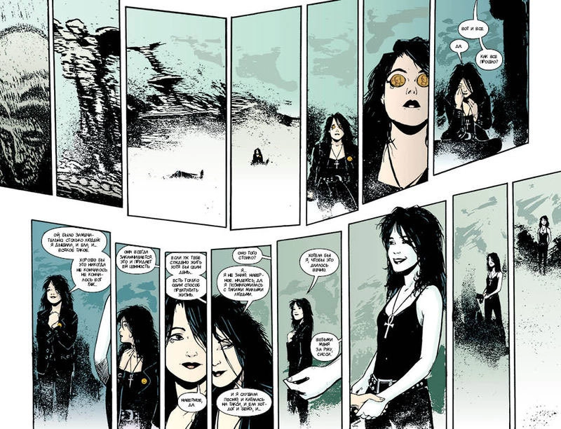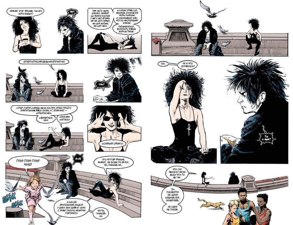 И надо сказать, это очень любопытный текст (не говоря уже о картинках). Вот казалось бы – ничего такого особенного. Мало того, что тема не из приятных, так ещё и сюжет не самый увлекательный – порой даже кажется, что и не происходит тут ничего вовсе. Как-то уж слишком всё просто. Но между тем именно в этой обманчивой простоте и таится секрет странного обаяния каждого выпуска этого графического романа. Гейман не пугает нас, а магическим образом убаюкивает – заставляя читателя словно под гипнозом перелистывать страницы. Смерть в его исполнении обожает фильм «Мэри Поппинс» (и с помощью российского переводчика даёт перевод знаменитому «Supercalifragilisticexpialidocious» - «Суперпотрясающевеликориятно!») – разве это может быть страшно? А умереть после шутки о Бэтмене – разве не забавная ирония в нарисованном мире? А эпизод, когда знаменитостей тошнит от нового фильма, но при этом журналистам они врут как по писаному: «Просто шик, в самую точку, очень современно!» - довольно ведь узнаваемо.