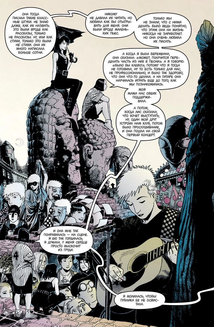 Для «обычного» комикса это определённо перенаселенная история: лиц тут заметно больше, чем требуется для рассказа. Но многочисленные мимолётные персонажи придают действию плотный фон, обеспечивают ту самую жизненную суету, которая полезна вообще в любом произведении, но так необходима в особенности здесь – с такой-то героиней. Справедливо ведь сказано: «Мы так заняты жизнью и не находим времени заметить, что мы живы. Но иногда – замечаем! И именно это придает смысл всему остальному».