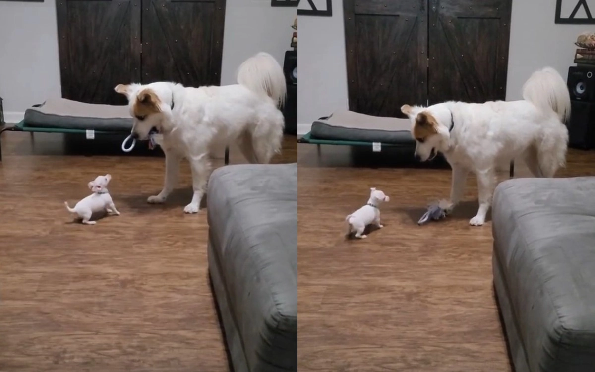Крохотный щенок поразил своего старшего брата, когда начал требовательно лаять, чтобы получить игрушку, которую взрослый пес держал у себя в зубах. Наверняка, в этот момент меленький собакен казался себе настоящим волкодавом. Но, как бы ни было, он своего добился: пес, удивленный нахальностью мелкого, просто выронил игрушку. Придется ему поиграть с чем-нибудь другим, если, конечно, крохотный домашний тиран не отберет и это тоже.