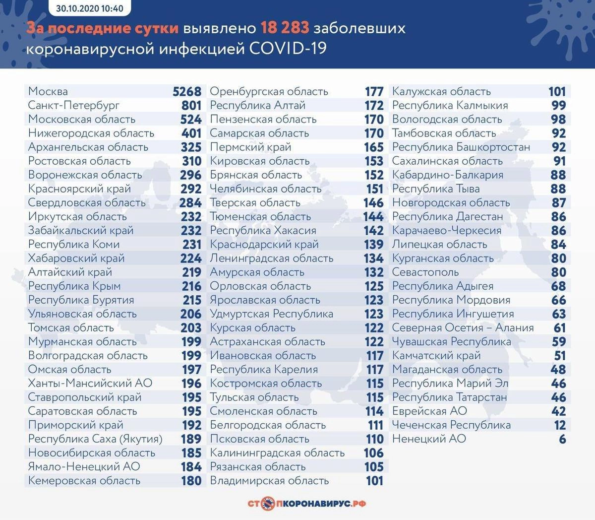 Напомним, что за последние сутки в России зафиксировано рекордное количество случаев заражения коронавирусом — 18 283. Скончались от болезни 355 человек. Об этом информирует оперативный штаб по борьбе с распространением опасной инфекции.