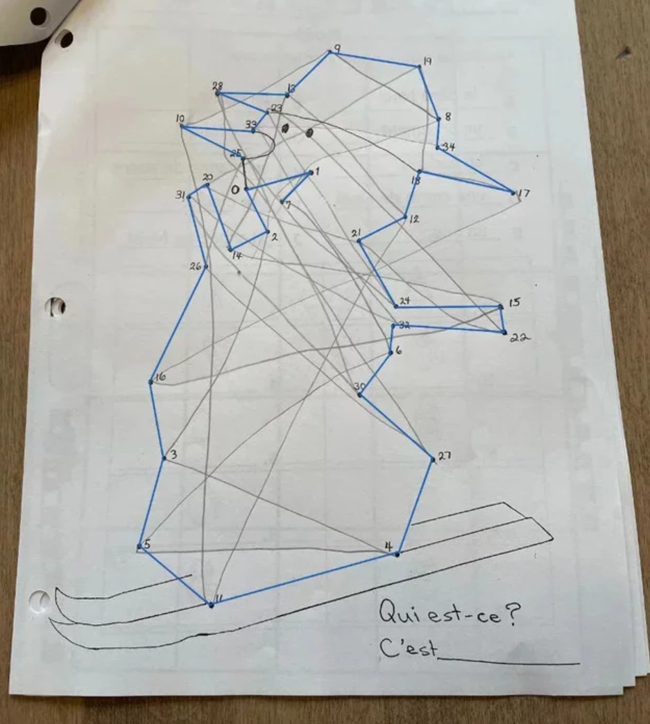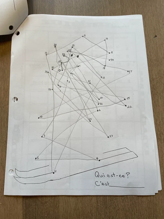 Ответ: скорее всего, это задание для изучения языка (в данном случае французский). Учитель называет цифры не по порядку, а ученики должны их соединить и в конце ответить на вопрос «Кто на картинке?», в вашем примере это снеговик.
