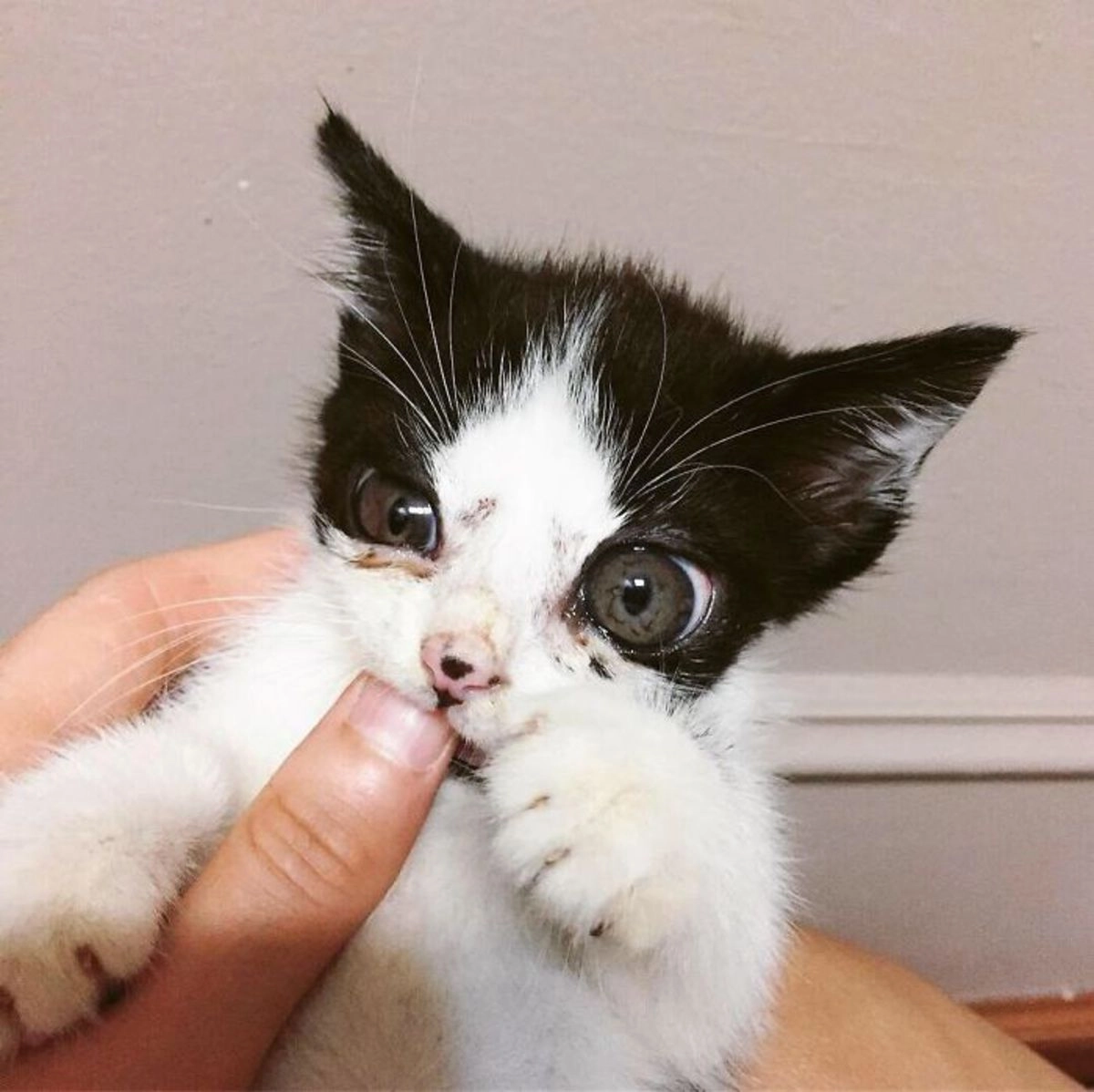 Этот крошечный котёнок был найден в картонной коробке на крыльце чужого домов. Жильцы отвезли его к ветеринару, который обнаружил у животного большую рану на шее, очень маленький вес и огромные, словно стеклянные, глаза.