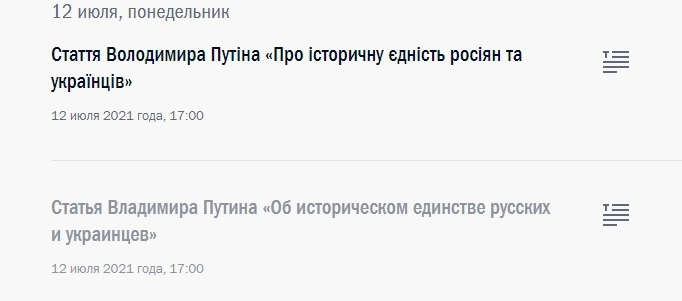 12 июля президент РФ Владимир Путин опубликовал на сайте kremlin.ru статью о русско-украинских взаимоотношениях, которую он обещал написать еще во время последней прямой линии с россиянами. В опубликованной статье глава государства подробно изложил свою позицию, начиная с общего исторического пути русских, украинцев и белорусов в рамках Древней Руси и заканчивая оценкой трагических событий в Донбассе.