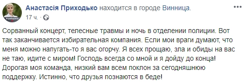 Она также добавила, что вот так для нее заканчивается избирательная компания. «Если мои враги думают, что меня можно напугать, то я вас огорчу», — написала Приходько, заявив при этом, что прощает всех.