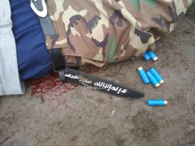 Также в Сети появились новые снимки тела кизлярского стрелка, на которых видно, что при себе у него были предметы с символикой запрещенного в России террористической организации «Исламское государство», в частности, чехол для ножа.