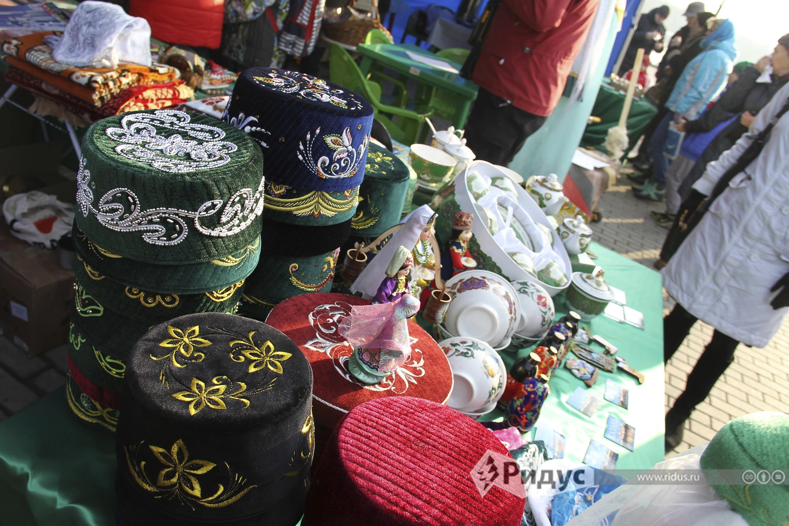 Рядом с главной, русской, палаткой раскинулась самая крупная — татарская. Народные промыслы Татарской республики представлены, по большей части, ювелирными изделиями: бирюза, агаты и кораллы, обрамленные серебром или золотом, выполнены в традиционном стиле с гравированным орнаментом. По словам Гюльнары Госмановой, татарские драгоценности издревле служат женщинам не столько украшениями, сколько сакральным оберегом. Например, национальное нагрудное украшение «тамакса» должны носить как молодые девушки так и замужние женщины.